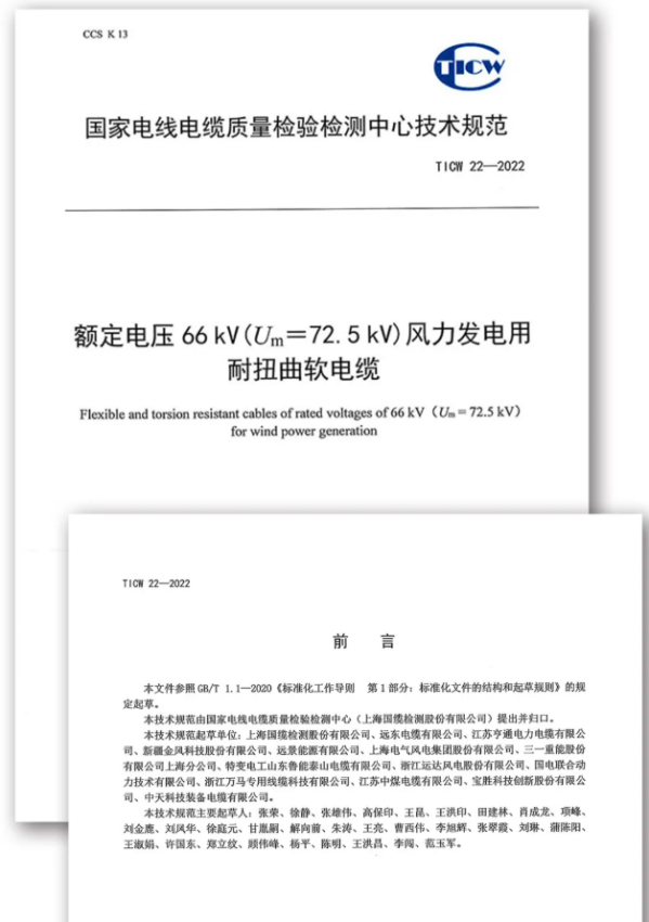 值得一提的是,远东电缆参与制定的TICW22-2022《额定电压66kV(Um=72.5kV)风力发电用耐扭曲软电缆》技术规范已经正式发布,对大功率海上风力发电机的电缆选型和安全运行起到积极作用,也彰显了远东电缆在66kV高压耐扭软电缆研发上的领先地位。