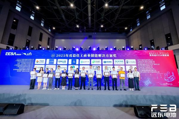 在8月13日举行的EESA星光颁奖典礼上,远东电池凭借出色的产品力与解决方案,荣获了“2025年度最佳工商业储能解决方案”和“2025年度最佳源网侧应用场景创新项目”两项大奖。远东电池资深合伙人、远东电池储能研究院负责人马成龙代表公司上台领奖,此次获奖代表着行业、市场、客户对公司产品和解决方案的高度认可。远东电池始终聚焦客户需求,致力于打造更经济、高效、安全、智能的储能解决方案,持续引领行业发展方向。远东电池高级合伙人、远东电池江苏监事、储能国内客户官崔栋荣获“储能优秀青年奖”,彰显了行业对其专业实力与突出贡献的认可,也体现了远东电池在推动行业进步中的多元化力量。